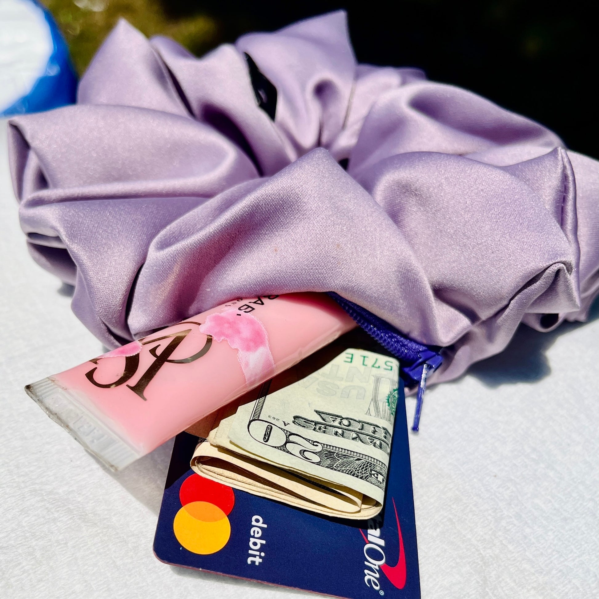 This handmade scrunchie with a pocket better known as "The Pocket Scrunchie" is the perfect way to add a little extra convenience to your life. The pocket scrunchie is made from high-quality, durable satin material and is securely attached to the scrunchie. You can easily slip small items, like money, cards, or keys, into the pocket, so you don't have to worry about carrying them in your pockets or purse. The pocket scrunchie consists of a comfortable material to prevent any irritation or chafing on the skin.